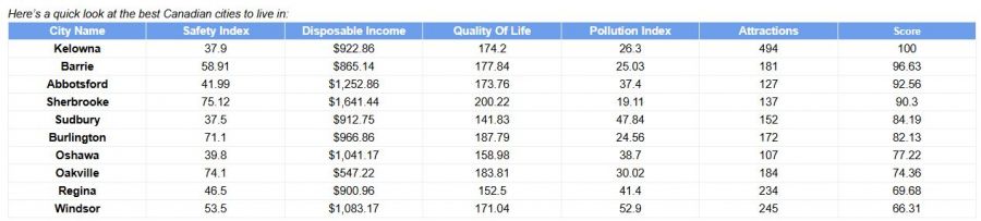 Otherwise, Kelowna tended to rank in the middle of the pack or below average on the safety, disposable income, quality of life and pollution indexes.